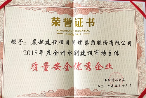 2019年5月20日,集团收到青海省玉树州水利局颁发授予集团2018年度质量安全优秀企业的荣誉证书。2018年5月8日,玉树市国庆水库工程正式开工,集团玉树市国庆水库项目部所有人员以高昂的精神面貌和满腔的热情投入到工程的建设中,对进度、投资、质量、安全等方面进行高度管控,在2018年中无一质量和安全事故发生,得到了业主单位以及玉树州水利局的高度认可。