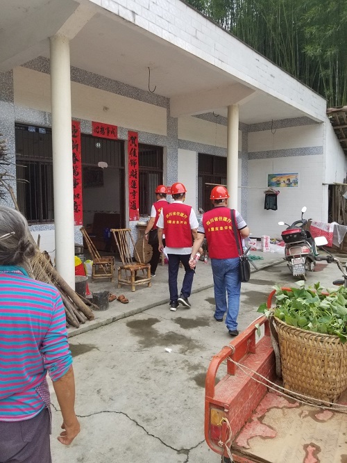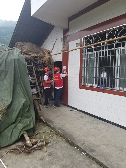 这次核查时间紧、任务重,专家组兵分四路,由各组队长带领专家分别核查。当天天气异常炎热,专家组成员汗流浃背,用手擦擦汗水继续工作,记录的表格都被汗水打湿了。中午吃过午饭,马上又投入到工作中,还经历了一场不小的余震。五一村4组村民69户,是户数最多的组,其他三个组核查完成后立即支援4组,于下午四点前完成硐底镇五一村185户房屋受损情况的核查工作。