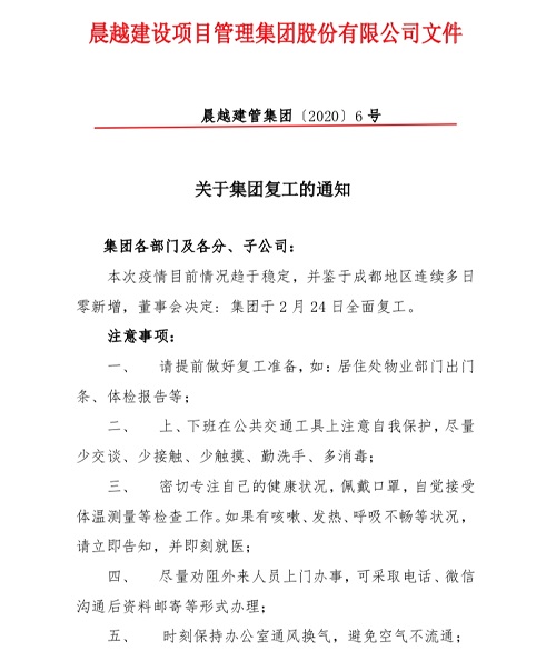 2月24日(农历二月初二),晨越建管集团正式复工,在集团董事会带领下,晨越人认真组织、平稳生产,作出系列复工前准备工作,推动集团复工稳步有序,保障员工身体健康。