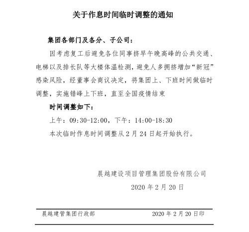 做好疫情防控措施和安全生产是集团全面复工的前提和基础,让防控和发展“齐步走”,对此,集团对所有人员信息进行备案,制定《晨越建管复工防疫指南》等文件;各分公司、项目部根据项目所在地行政主管部门要求,加强项目防疫工作监督,全力确保疫情防控和项目建设“两不误”,为集团冲刺年度任务目标奋力助力加油。