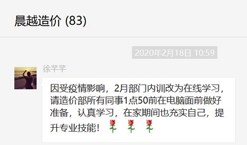 学无止境!疫情防控期间,在公司领导的带领下,造价公司的同事们没有因为在家办公而松懈,反而利用这个期间积极组织大家共同学习,共同进步,为今后的造价工作打下良好的基础。