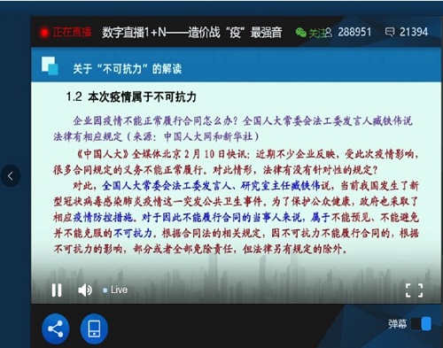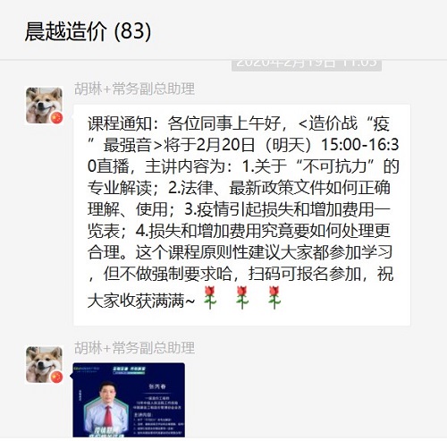 于2月20日下午3点,公司组织造价公司人员线上学习主题为<造价战“疫”最强音>的学习,主讲内容为:1、关于“不可抗力”的专业解读;2、法律、最新政策文件如何正确理解、使用;3、疫情引起损失和增加费用一览表;4、损失和增加费用究竟要如何处理更合理。本次培训,主要针对疫情期间相关政策的剖析,及相关费用计取的处理。