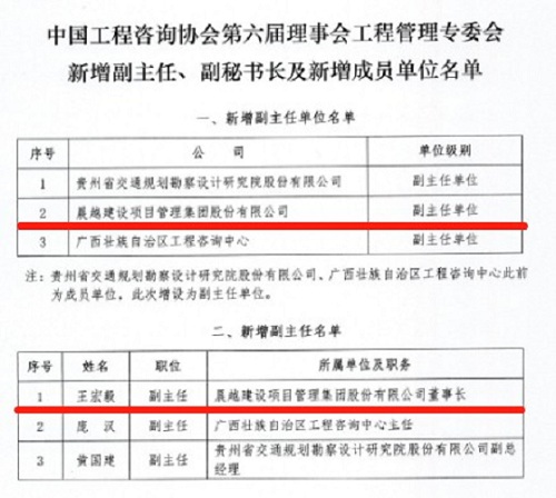 近日,中国工程咨询协会(中咨协政研[2020]21号)文件宣布晨越建管集团当选中国工程咨询协会工程管理专业委员会副主任单位,集团党委书记、董事长王宏毅任副主任。