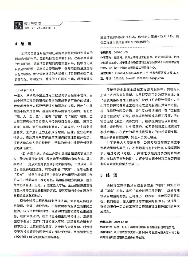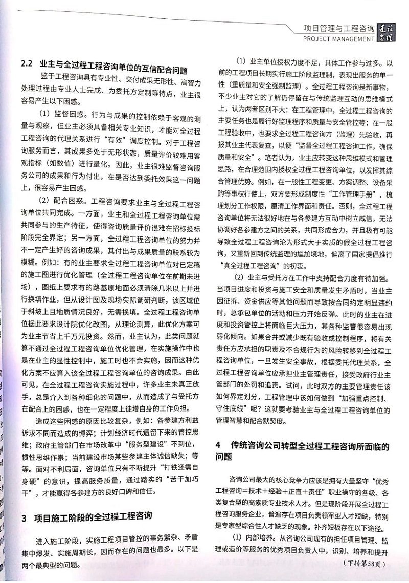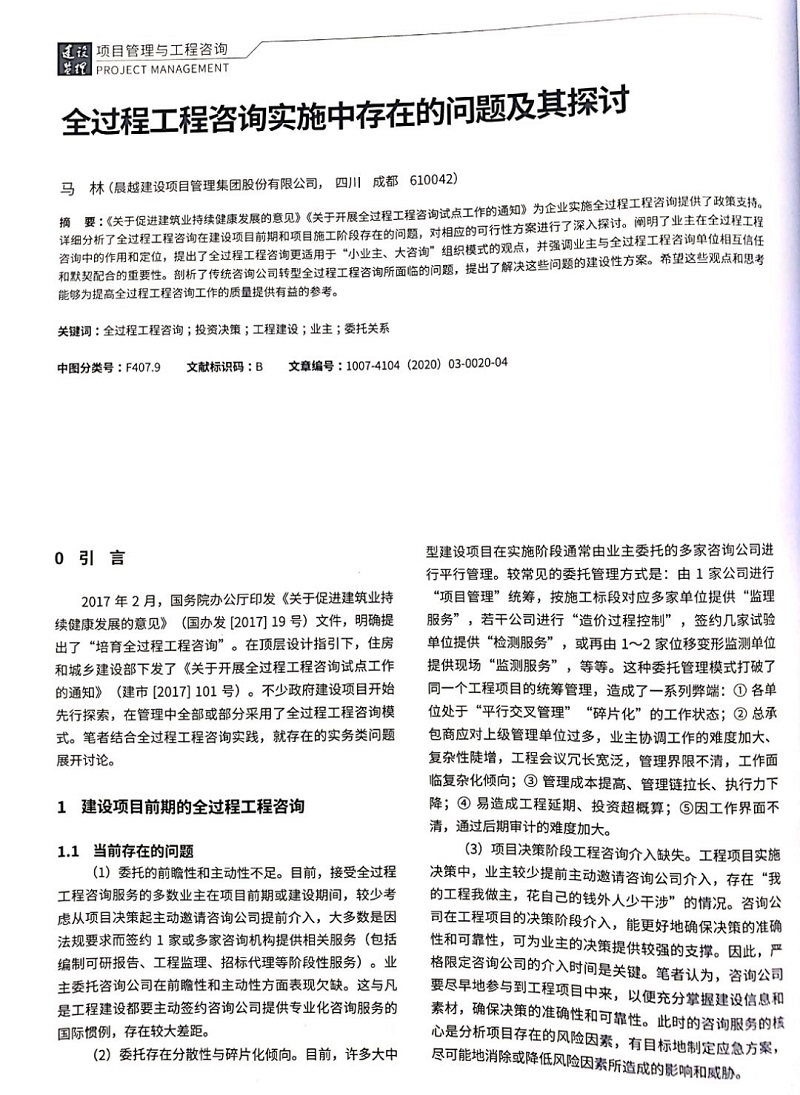 由集团公司马林结合实际工作经历与体会撰写的《全过程工程咨询实施中存在的问题及其探讨》论文,近日在2020年第3期《建设监理》杂志发表。该论文以“写实性”、近似“白描”的手法,就全过程工程咨询在实施中存在的各类问题进行了探讨与回顾,并提出了解决思路及办法。对全过程工程咨询模式在建设项目管理中的推广,提升业主及咨询企业的应对管理水平,具有重要的现实参考价值和借鉴意义。