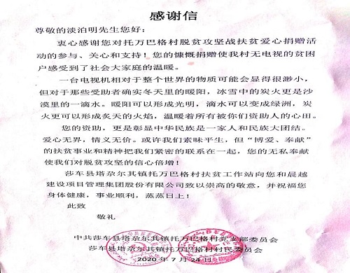 2019年9月,晨越建管代建项目部为塔尕尔其镇贫困户捐款17,500元。