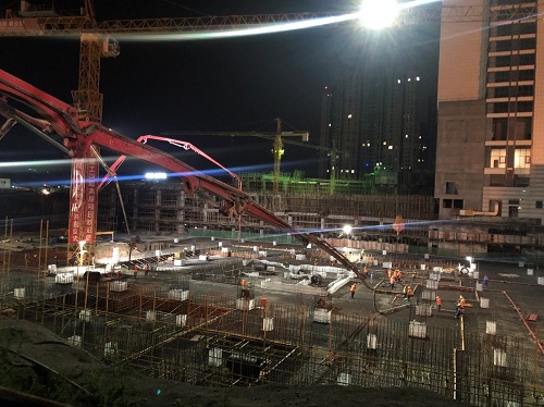 2019年4月26日,项目迎来了12000m3大体积混凝土筏板基础浇筑,大体积混凝土裂缝控制是该阶段监理工作重点。浇筑前项目全体人员对混凝土裂缝产生原因和控制措施进行探讨,集思广益,周密部署,制定并审核通过了《大体积混凝土施工方案》和《大体积混凝土温差监测方案》。浇筑从4月26日21时开始至4月29日7时结束,持续58小时。