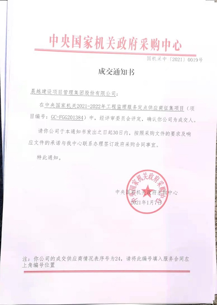 近日,集团收到中央国家机关政府采购中心《成交通知书》,确认晨越建管集团为“中央国家机关 2021-2022 年工程监理服务定点供应商征集项目” 成交人,承担中央国家机关各部门及其在京所属各级行政机关、事业单位和团体组织的工程监理服务。