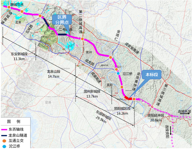 成都东西城市轴线西起于都江堰市区,东面至三绕外成都市的市域边界,全长约150公里。整个东西城市轴线串联都江堰、龙泉驿、简州新城、简阳等9个区域,连接沿线14个产业功能区。东西城市轴线(东段)简阳段西起于龙泉驿区界,串联简州新城、简阳市,东至金简黄快速路,按城市快速路标准设置,总长32公里,结合公园城市建设理念,建成后将是城市交通轴、景观轴、产业轴。