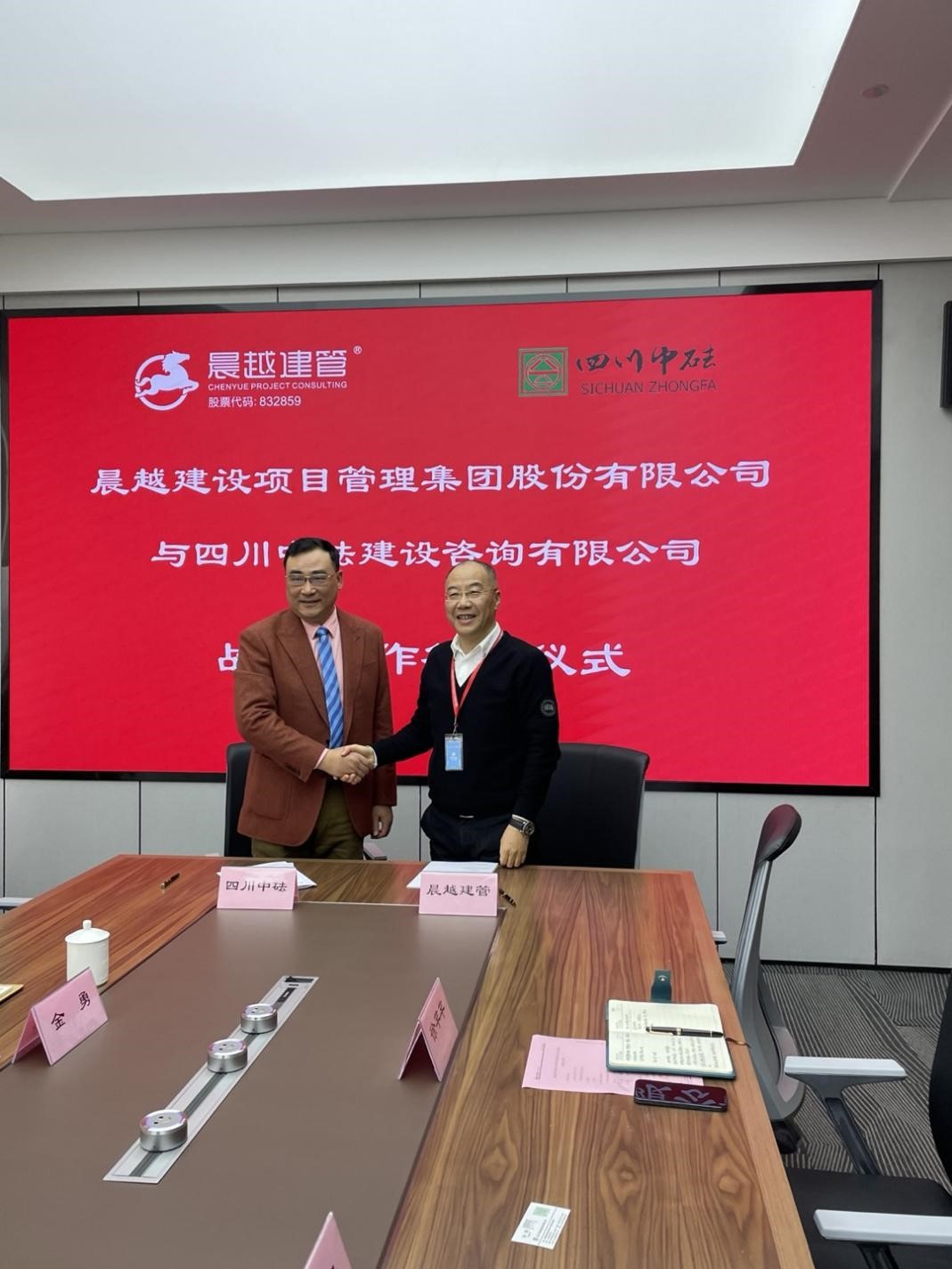 2021年12月15日,集团与四川中砝建设咨询有限公司战略合作签约仪式在集团总部大楼23层举行。四川中砝建设咨询有限公司总经理余红兵、副总经理金勇、总经办经理王婷,晨越建管集团党委书记、董事长王宏毅,副总裁陈代莲、公司领导徐芊芊、资源保障部总经理王固越出席了签约仪式。