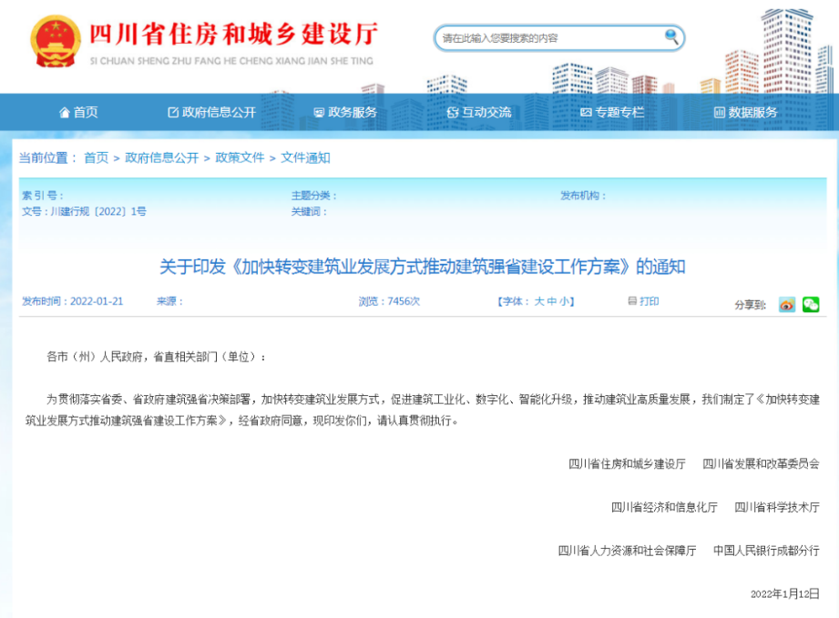 2022年1月,四川省住建厅联合四川省发展和改革委员会、四川省经济和信息化厅、四川省科学技术厅、四川省人力资源和社会保障厅、中国人民银行成都分行五部门发布关于印发《加快转变建筑业发展方式推动建筑强省建设工作方案》的通知,明确:支持投资咨询、勘察、设计、监理、造价等企业联合重组向全过程工程咨询服务企业转型。大力推行工程总承包,推广全过程工程咨询。装配式建筑、政府投资项目、国有资金占控股或主导地位的项目、抢险救灾项目以及大型公共建筑建设内容明确、技术方案成熟的,应优先采用工程总承包、全过程工程咨询模式组织建设。力争到2025年培育50家全过程工程咨询骨干企业。