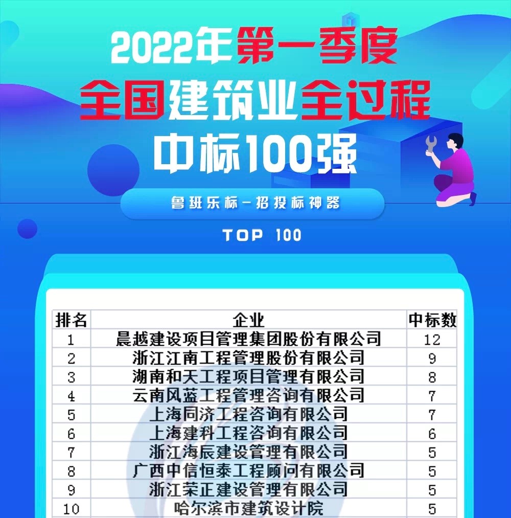近日,鲁班乐标发布全国2022年第一季度全过程工程咨询中标百强榜单,根据全国各省市公共资源交易中心数据统计,晨越建管集团以中标12个全咨项目位居榜首。继2020年、2021年连续两年晨越建管位列全国全咨中标百强榜第一名之后,晨越建管2022年继续领跑全国!
