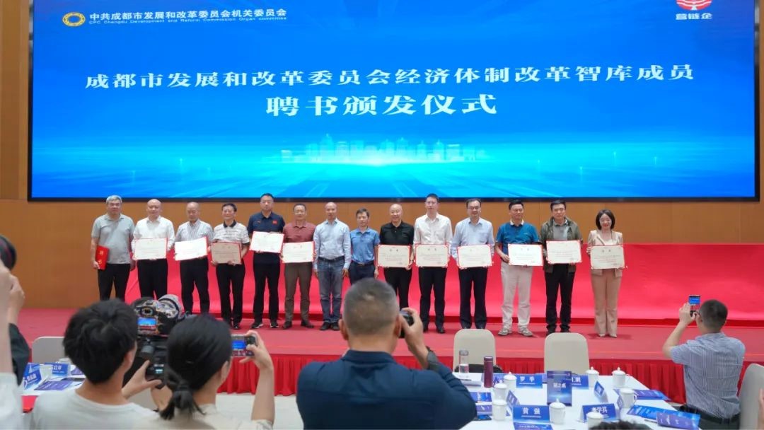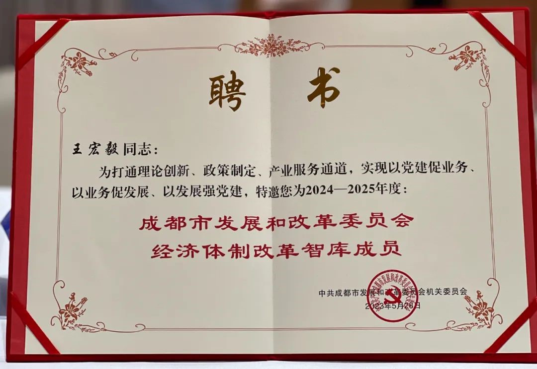 此次成都市发改委经济体制改革智库(2024-2025年度)遴选出知名高校和科研机构的教授,财税、法律、金融等领域的专家学者,大中型企业的优秀企业负责人为智库成员。受聘仪式现场,市发改委经济体制改革处处长黄强为王宏毅董事长颁发聘书。