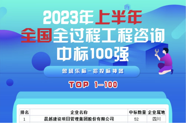 2023年7月11日,鲁班乐标发布“2023年上半年全国全过程工程咨询中标100强”榜单,晨越建管集团以中标52个项目位列榜首。继2020、2021、2022连续三年斩获全国全过程工程咨询中标百强第一名之后,晨越建管集团2023上半年全国全咨中标百强榜再拔头筹!