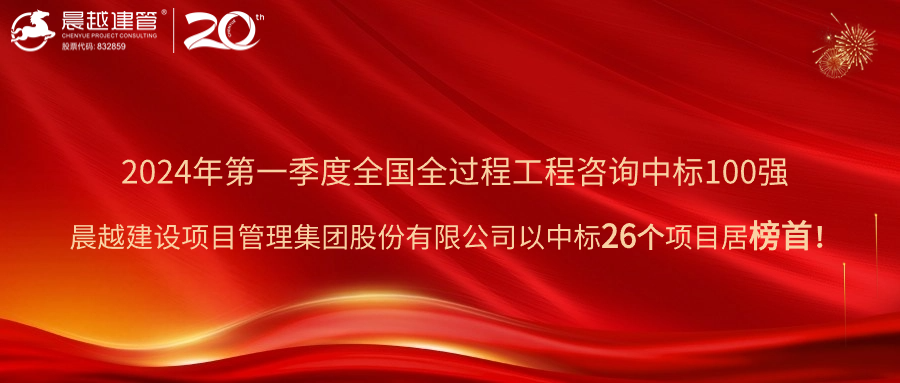 2024年4月18日,鲁班乐标根据全国各省市公共资源交易中心数据统计发布“2024年第一季度全国全过程工程咨询中标100强”榜单,晨越以中标26个全过程工程咨询项目位居榜首。
