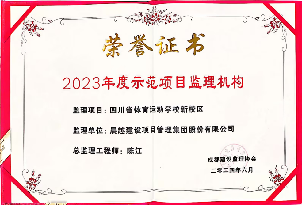 近日,晨越建管集团喜获成都市建设监理协会颁发的“2023年度优秀监理企业”荣誉,四川省体育运动学校新校区项目获“2023年度示范项目监理机构”荣誉,集团总监陈江荣获“2023年度优秀总监理工程师”称号。