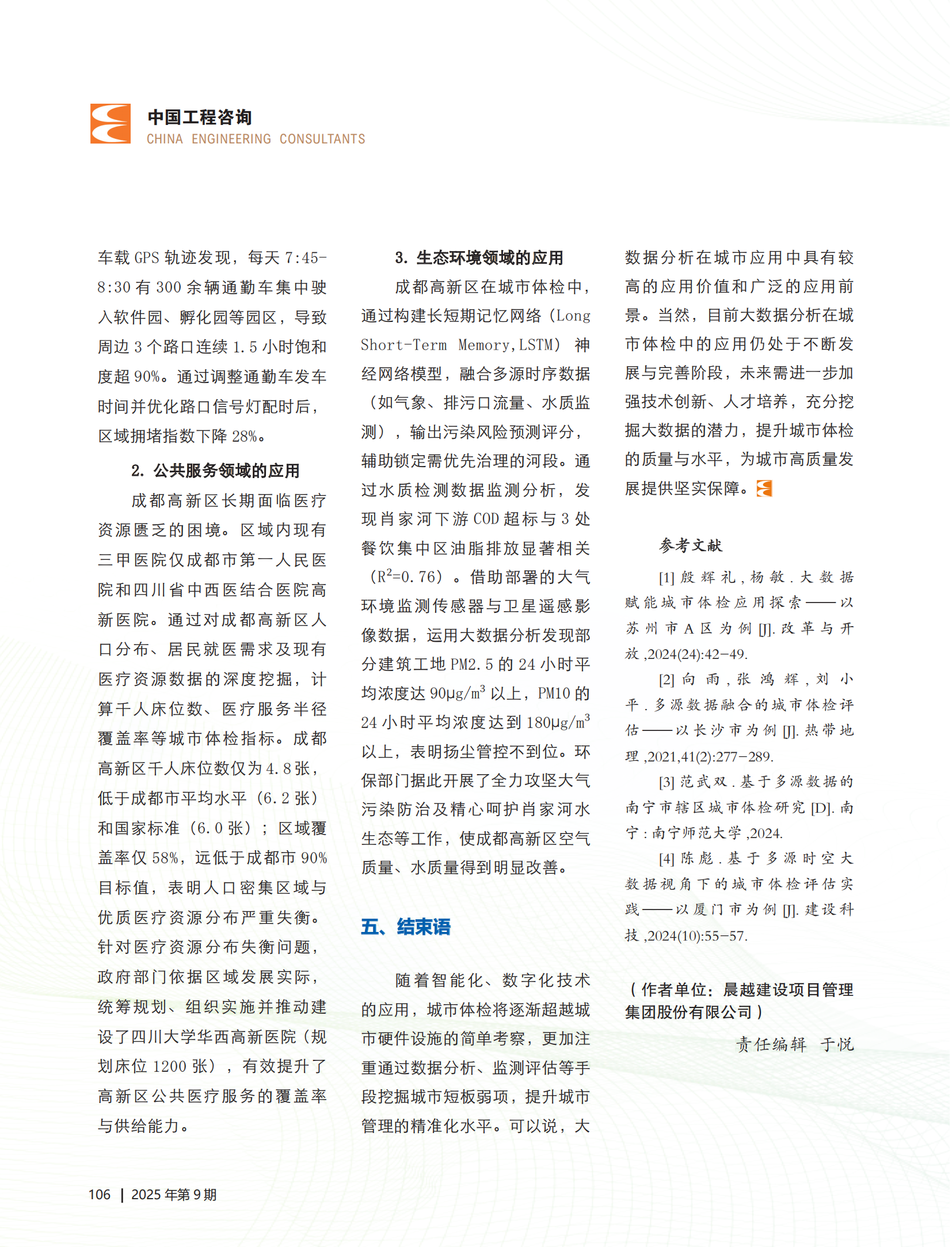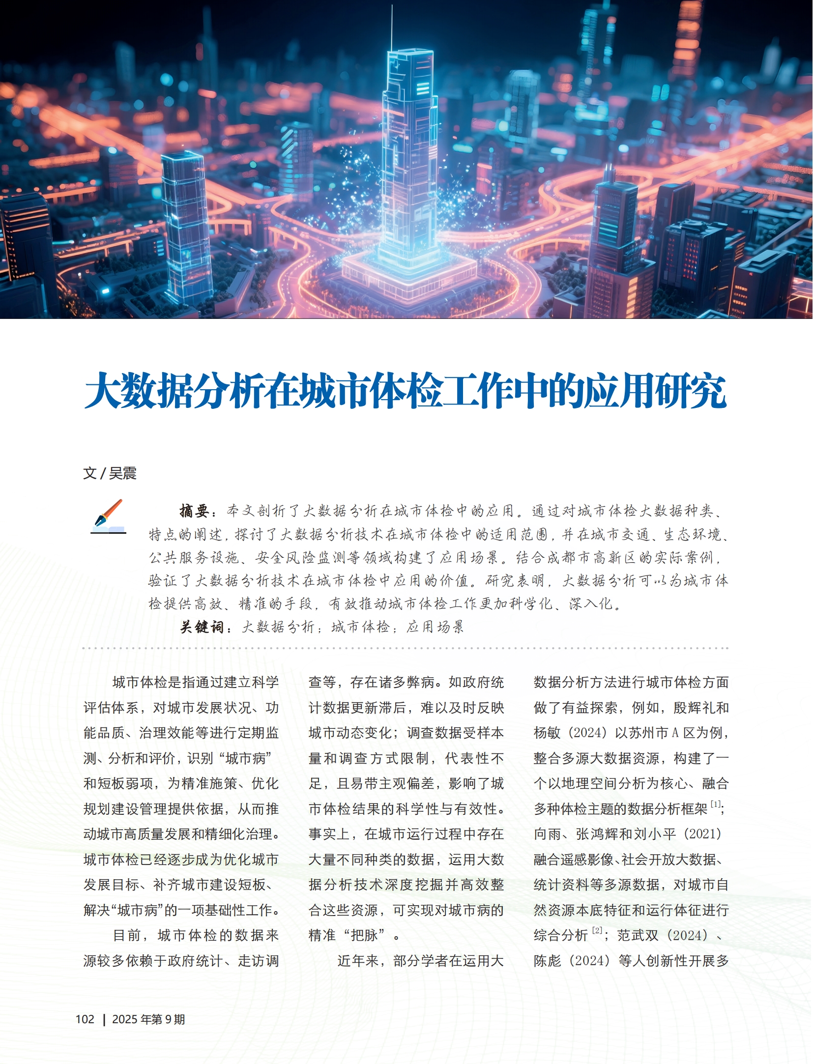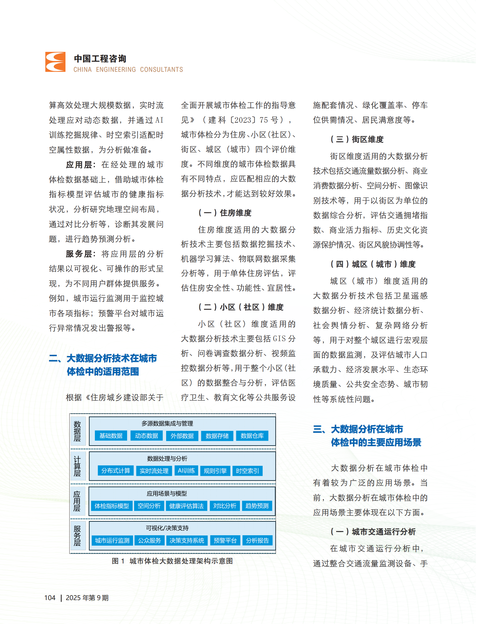 近日,集团聚焦城市体检领域的专题文章在《中国工程咨询》杂志2025年第9期“专题研究”栏目发表,文章深度剖析了大数据分析技术在城市体检中的多维度应用路径,并以实证案例充分展现其在提升城市治理效能中的显著成效,为行业提供了兼具理论价值与实践参考的研究成果。