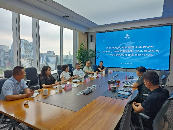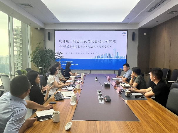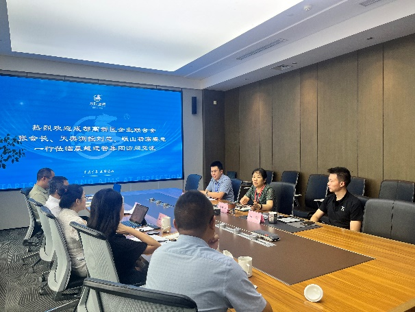 8 月 28 日,成都高新区企业联合会会长张敏、成都天奥测控技术有限公司总经理刘华、成都岷山精密测试与仪器技术研究院秘书长梁陈超一行到访集团进行交流。集团副总裁陈代莲、核电及新能源事业部副总经理张雷、院士工作站助理研究员张珽参加接待。