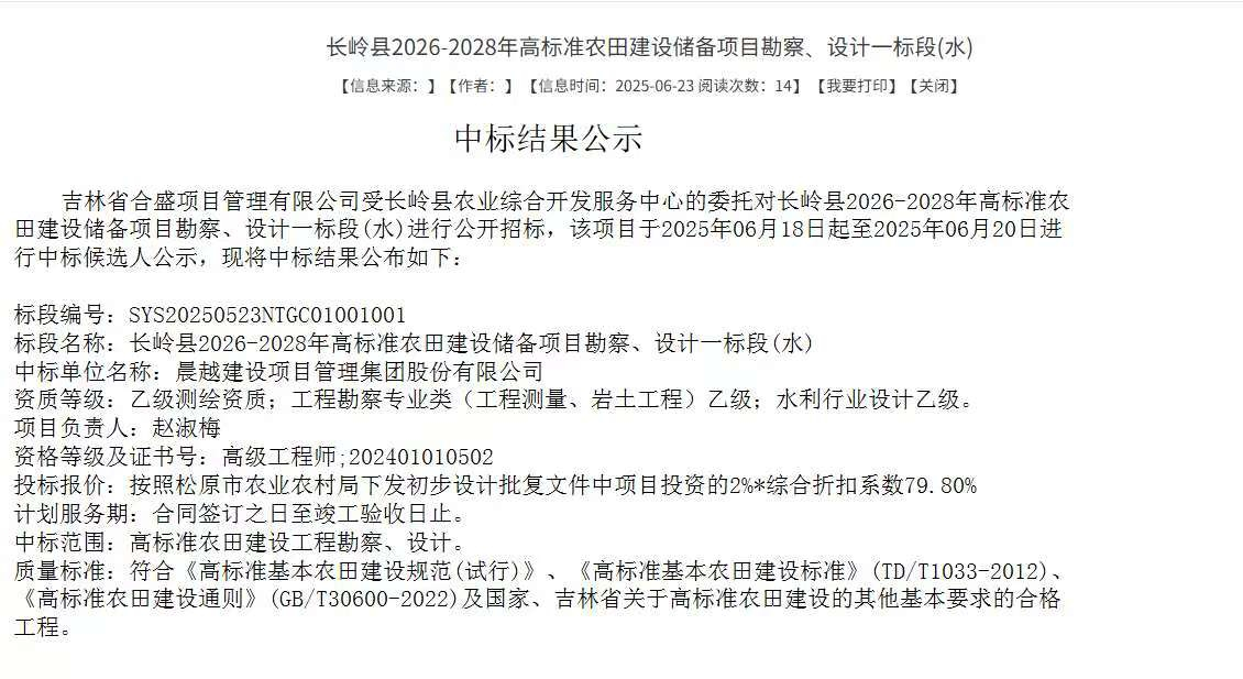 近日,长岭县 2026-2028 年高标准农田建设储备项目勘察、设计一标段(水)中标结果正式揭晓,晨越建管集团凭借深厚的技术积累与丰富的农业工程经验成功中标,将承担该项目的高标准农田建设工程勘察、设计任务。