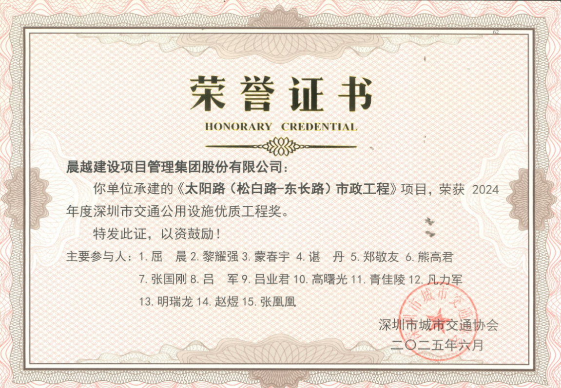 该项目荣获深圳市交通公用设施优质工程奖,是晨越建管集团在市政工程建设领域综合实力的体现。晨越建管集团将继续秉承“对结果负责”的核心理念,以专业严谨、务实高效的工作作风,以高标准、高质量的工作成果,努力为深圳城市建设做出更大贡献。