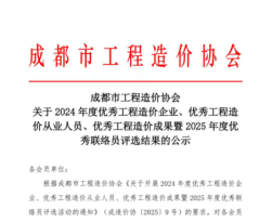 根据成都市工程造价协会《关于开展2024年度优秀工程造价企业、优秀工程造价从业人员、优秀工程造价成果暨2025年度优秀联络员评选活动的通知》(成造价协〔2024〕9号)的要求,集团资质管理部、造价部、总工办通力协作,对评选资料进行了认真准备和申报,经协会组织专家评审获得以上多项荣誉。