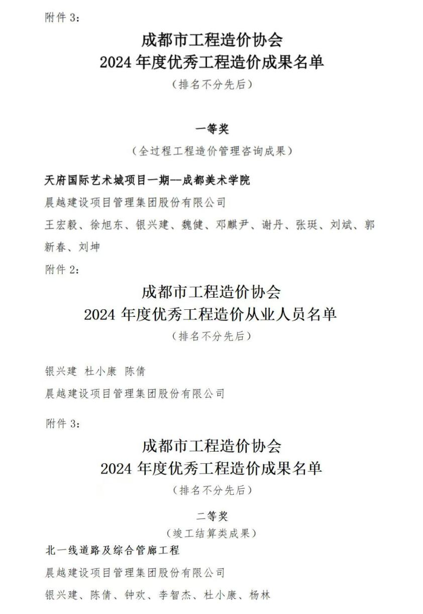近日,成都市工程造价协会公布了“关于表彰2024年度优秀工程造价企业、优秀工程造价从业人员、优秀工程造价成果暨2025年度优秀联络员的通知”。集团再次荣获“2024年度优秀工程造价企业”,这是晨越建管集团连续十三年获此殊荣!同时,集团天府国际艺术城项目一期——成都美术学院获“2024年度优秀工程造价成果一等奖”、北一线道路及综合管廊工程获“2024年度优秀工程造价成果二等奖”;银兴建、杜小康、陈倩获“2024年度优秀工程造价从业人员”。