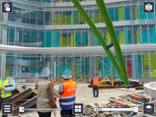 此外,项目创新性引入 AR 技术,将 BIM 模型投射至实体环境中,对项目重难点区域进行实模对比,实时发现并解决问题,有效辅助机电安装实体与模型校核、钢结构构件与模型校对等工作,确保施工精度与工程质量,为项目建设提质增效。