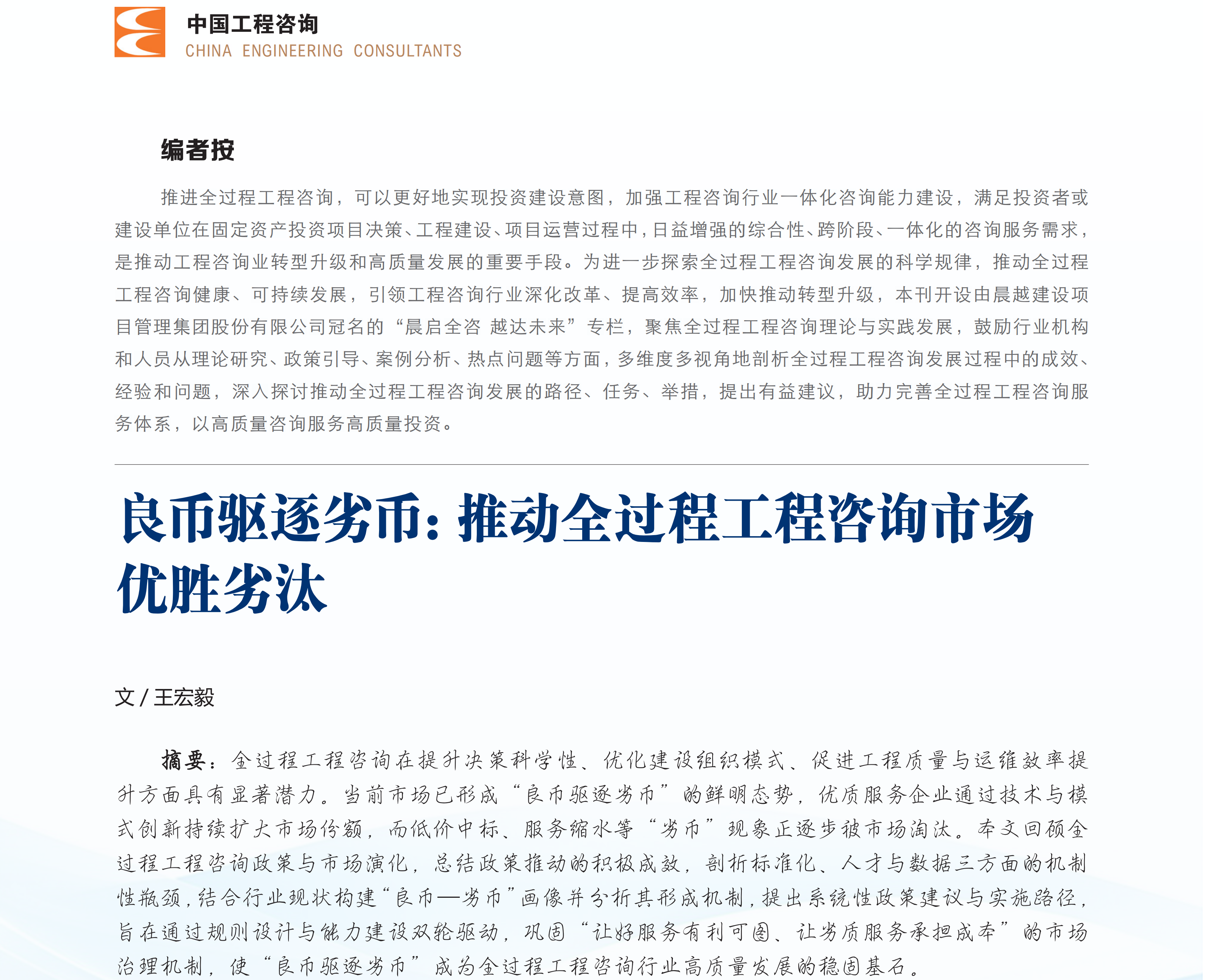 为进一步推动全过程工程咨询市场健康有序发展,王宏毅董事长署名文章 ——《良币驱逐劣币:推动全过程工程咨询市场优胜劣汰》在行业权威媒体《中国工程咨询》杂志发表。文章聚焦全咨市场 “良币驱逐劣币” 核心逻辑,指出行业痛点,提出解决路径:其一,针对当前全咨市场存在的政策落地不均衡、标准化瓶颈、人才结构性短缺、技术应用壁垒等痛点问题,文章结合中国工程咨询协会等权威机构发布的数据,以及晨越建管数字化管控平台的实践案例,清晰拆解“良币” 与“劣币”的鲜明画像及形成机制,并创新性提出“规则构建 — 能力建设 — 激励监管”三位一体的解决方案,为全咨市场痛点破解明晰路径;其二,文章前瞻性预判未来十年全咨市场发展趋势,指出到 2035 年全咨市场规模有望突破 3 万亿元,对服务模式创新、技术迭代升级、复合型人才培养等提出设想和实现路径,为业内企业指明转型方向与着力点。