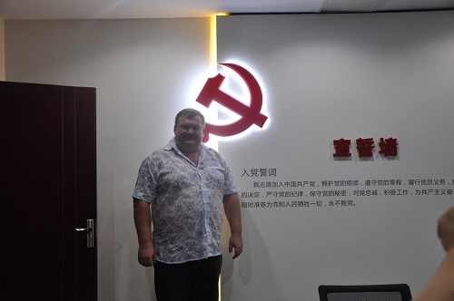 会谈结束后,尤里•杜特切科先生来到公司党员活动室,作为俄罗斯联邦共产党员的他站在共产党宣誓墙前重温了共产党的入党誓词,随后王董用普通话教尤里先生宣读誓词并高举右手共同宣誓。