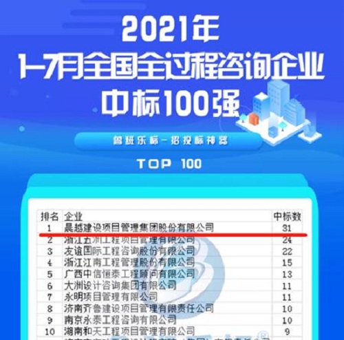 2021年8月1日,鲁班乐标根据全国各省市公共资源交易中心数据统计,发布 “2021年1-7月全国全过程咨询企业中标100强”榜单。晨越建管位列榜首,连续第二年获得全咨中标排名第一的佳绩!此前,在中国采购与招标网、中国名企排行网联合组织开展的“2020第十四届全国招投标领域年度聚焦”系列活动中,晨越建管被评选为“2020年中国全过程工程咨询行业综合实力百强”、“2020中国全过程工程咨询BIM咨询公司综合实力50强”。晨越建管在全过程工程咨询服务领域持续保持全国领先优势!