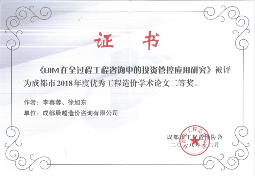 据了解,2018年11月,根据成都市工程造价协会《关于开展2018年工程造价学术论文征集和优秀论文评选活动的通知》(成造价协[2018]05号)要求,集团准备并提交了2018年度工程造价学术论文征集和优秀论文的申报材料。经评审委员会专家评审,2018年12月,由集团李春蓉和徐旭东编写的《BIM在全过程工程咨询中的投资管控应用研究》被评选为成都市2018年优秀工程造价学术论文二等奖。
